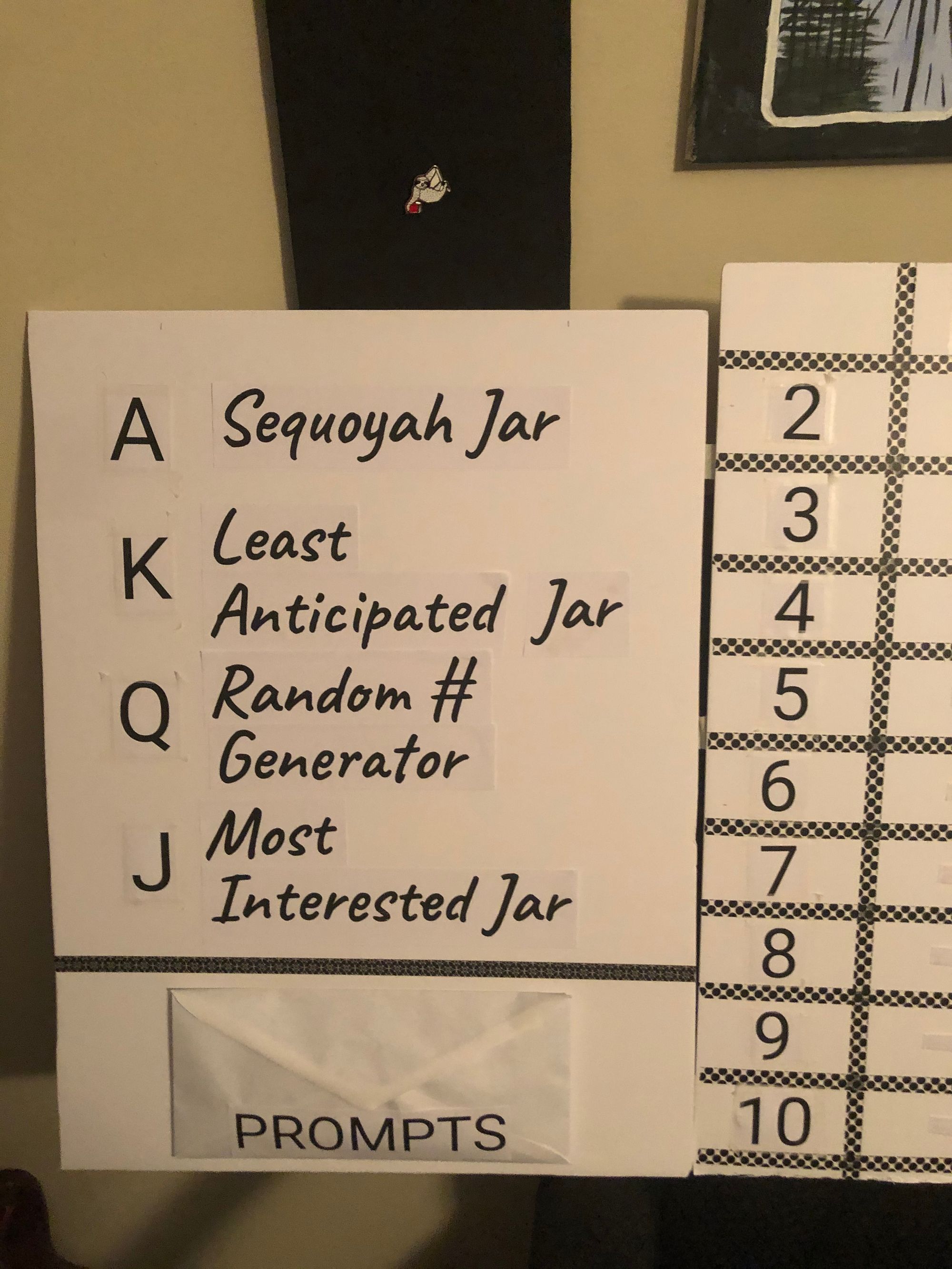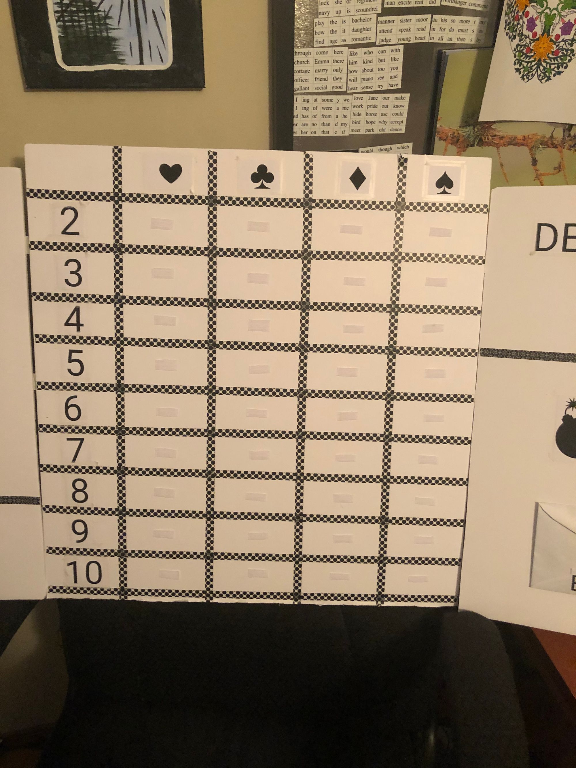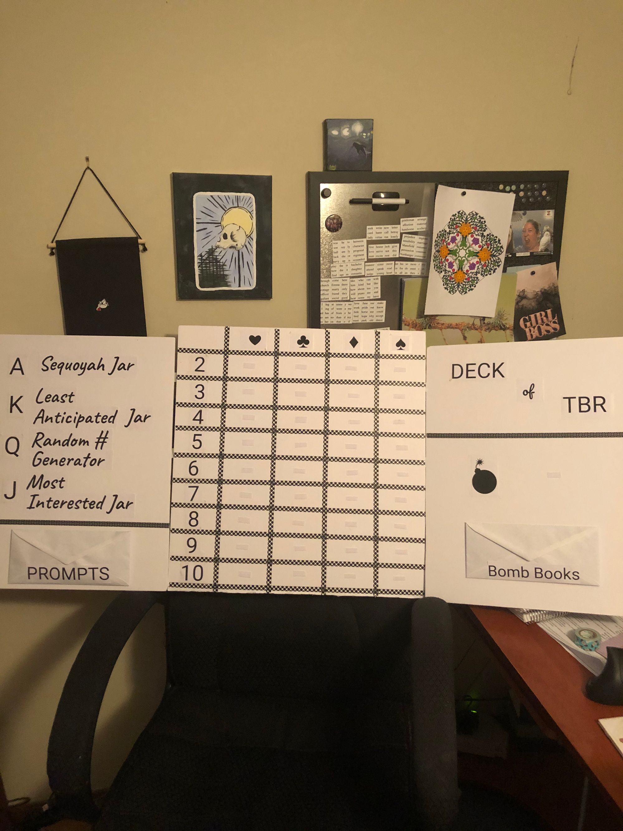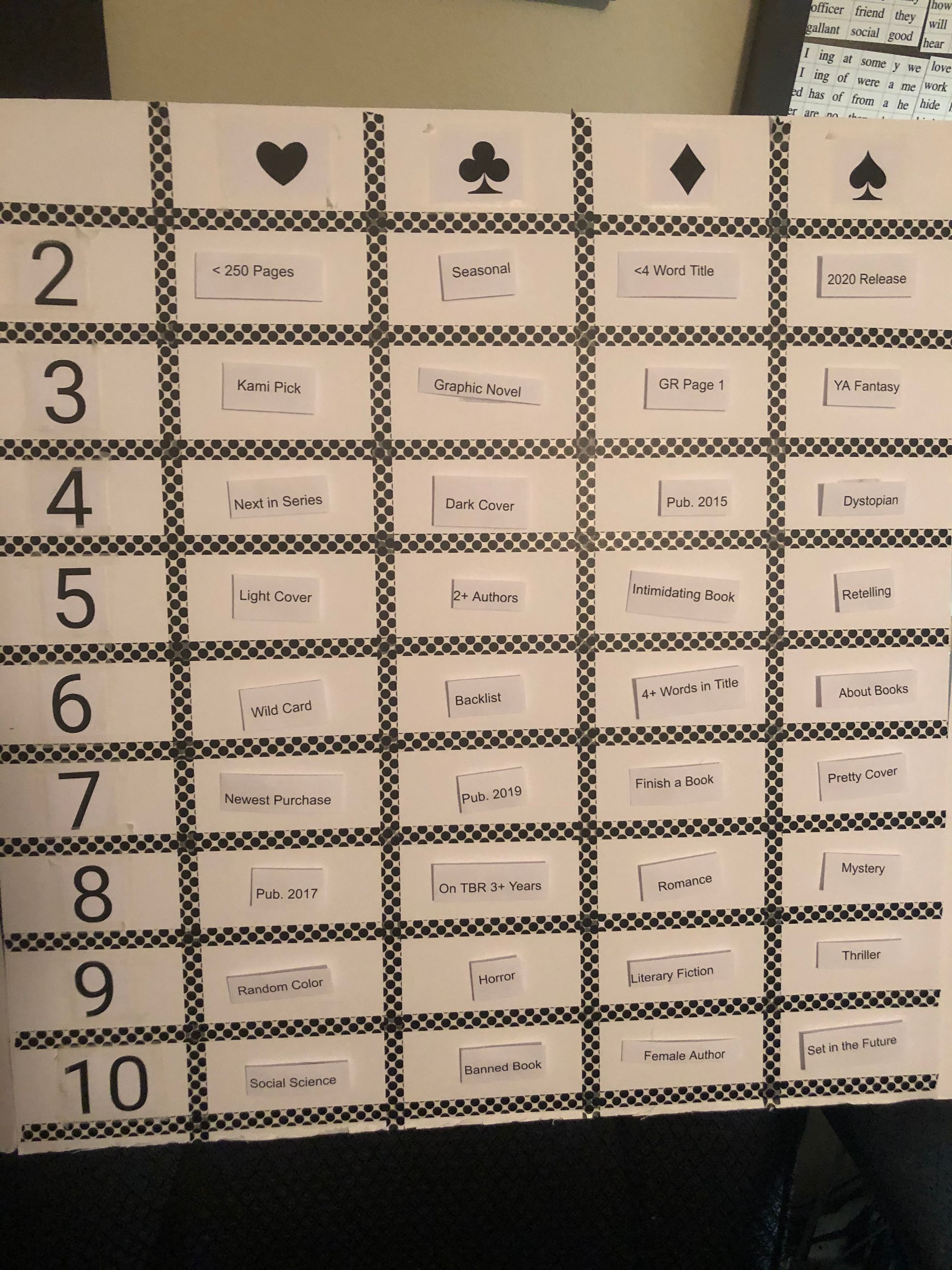 The middle of the board is filled with a grid with the card suits across the top and the numbers down the left side. I will fill the grip with book prompts. When I draw a card, I will go to that space on the board and follow the prompt to pick a book. I forgot to take a picture of the board before I began, or I would show you that now. But here it is before I stuck all the prompts on.