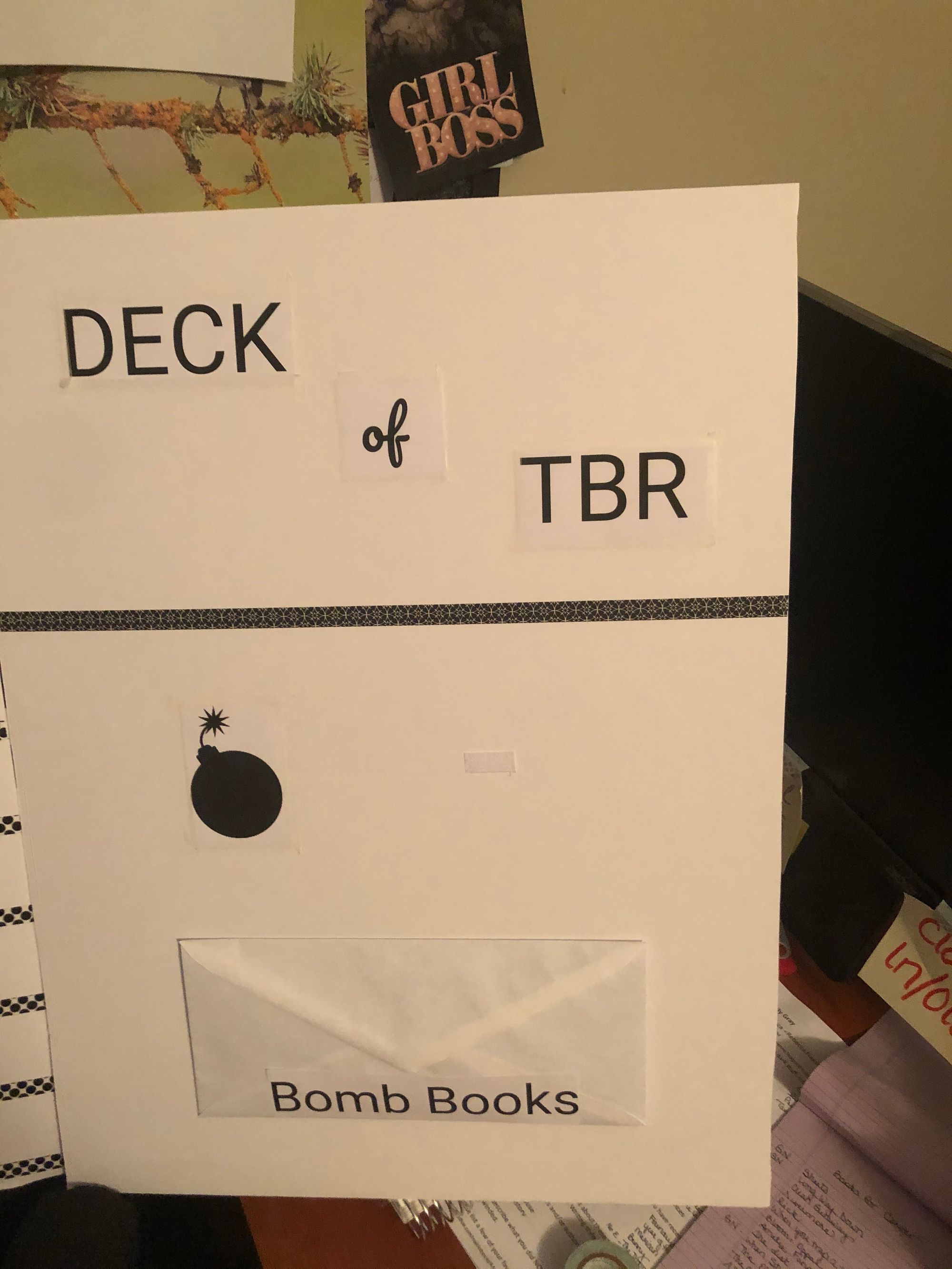 Over on the right, is the title of the game, and the Bomb Books section. In the envelope at the bottom is a selection of super intimidating books on my TBR. Before I start the game each month, I will pull out a slip from the envelope with the title of a book on it, and it will go on the board there next to the bomb.