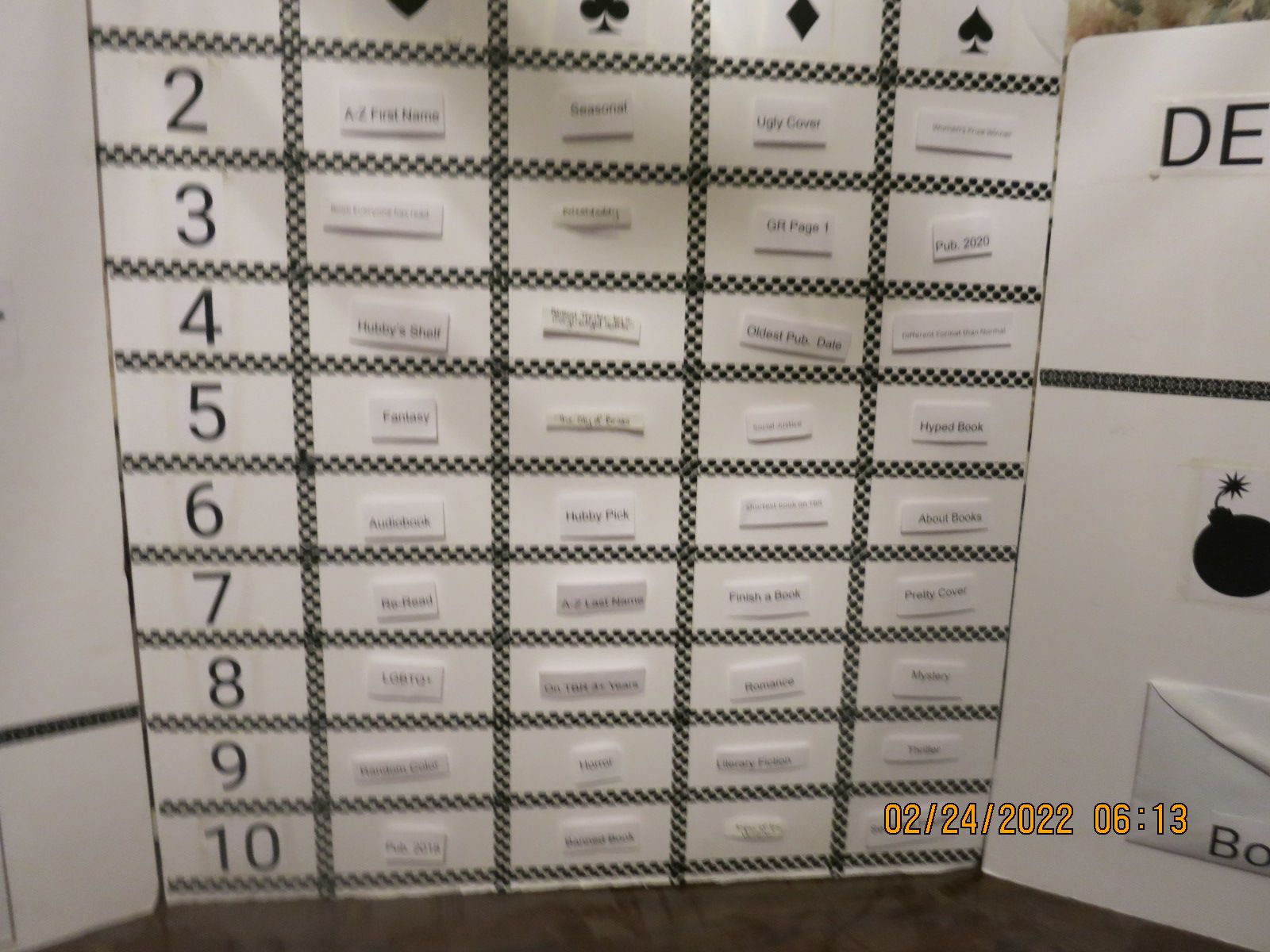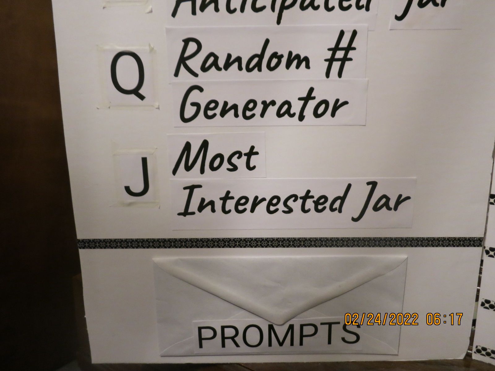 Here is where the board is to begin with. Unfortunately, the picture is really stinking blurry. Sorry about that.