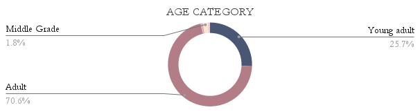 Age Category - Those two little slivers of beige or gray or whatever that is next to Middle Grade represent 1 Children's book, and 1 New Adult book. Mostly adult and a quarter young adult. That checks out.
