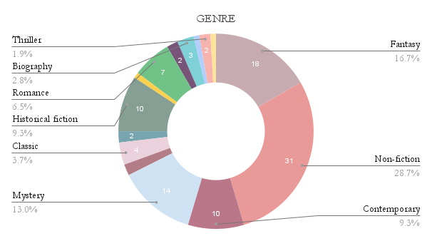 Genre - I think it's interesting that I read more nonfiction than any other genre, but it was still only 29% of my total reading. Usually it's closer to 50%.
